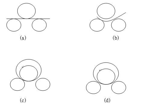 該機結構形式為三輥對稱式。上輥在兩下輥中間對稱位置作垂直升降運動,通過蝸輪、蝸桿而獲得,兩下輥作旋轉運動,通過減速機的輸出齒輪與下輥齒輪嚙合,實現板材的行走。當上輥的下壓力超過材料的屈服限度時,便使所卷制的材料變形,變形過程如下圖:
