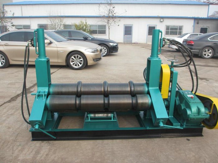 該機(jī)結(jié)構(gòu)形式為三輥非對(duì)稱(chēng)式。側(cè)輥在兩直列輥中間對(duì)稱(chēng)位置作平衡升降運(yùn)動(dòng),通過(guò)絲杠、絲母而獲得,兩直列輥?zhàn)餍D(zhuǎn)夾緊送料運(yùn)動(dòng),通過(guò)減速機(jī)的輸出齒輪與下輥齒輪嚙合,實(shí)現(xiàn)板材的行走。當(dāng)側(cè)輥輥的下壓力超過(guò)材料的屈服限度時(shí),便使所卷制的材料變形,從而達(dá)到卷制直徑達(dá)大小: